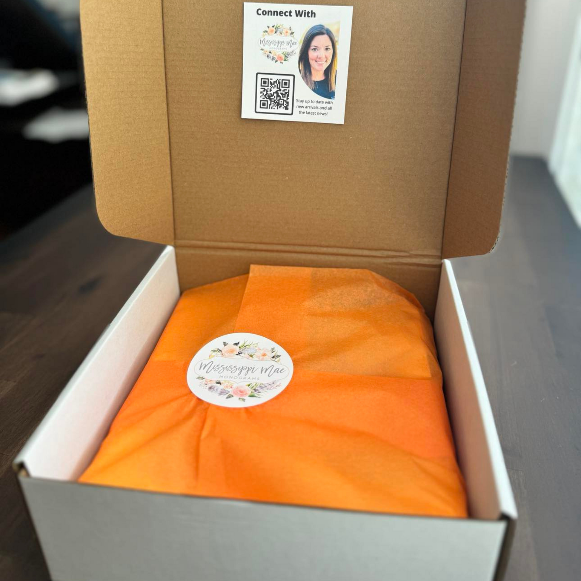 The towels will come folded with twine and a Mississippi Mae card tied on it. Tissue paper color may vary.