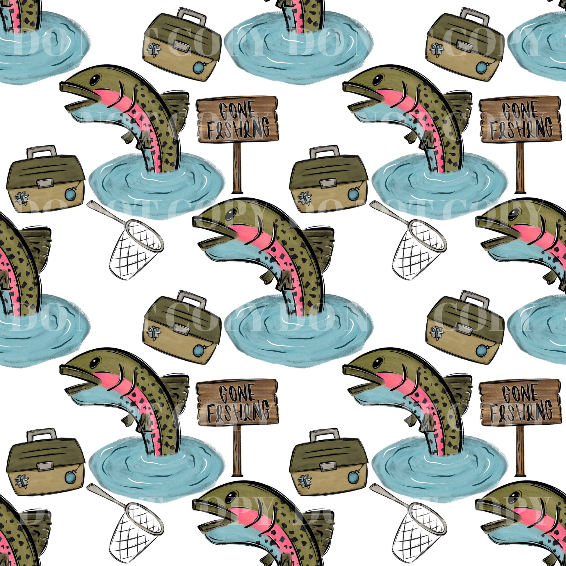 -Fishing Pattern – fish, tackle box, net, and “Gone Fishing” sign