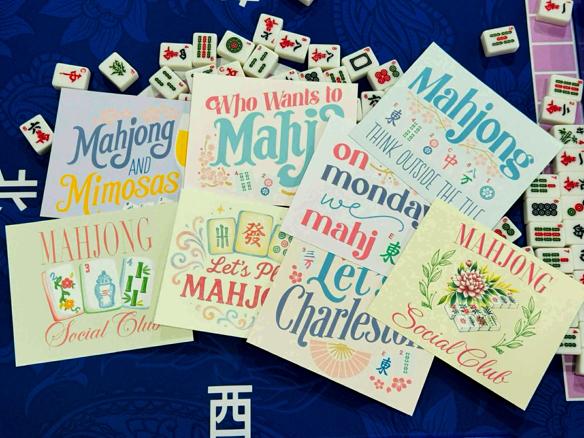 Each card features playful Mahjong-themed sayings such as: